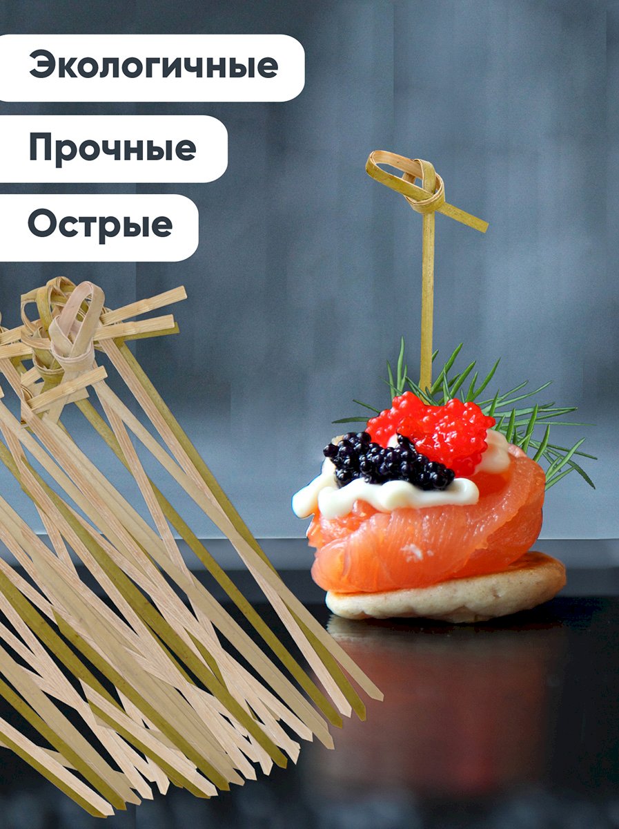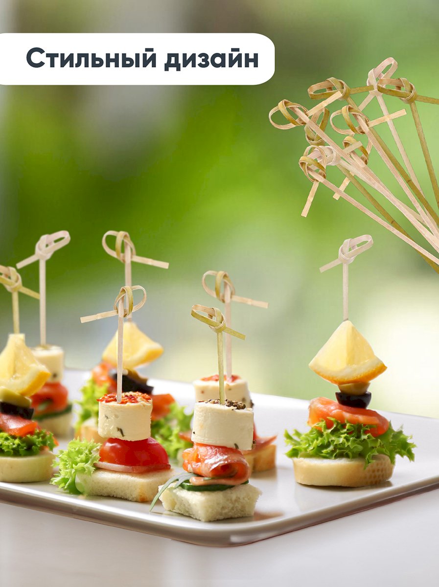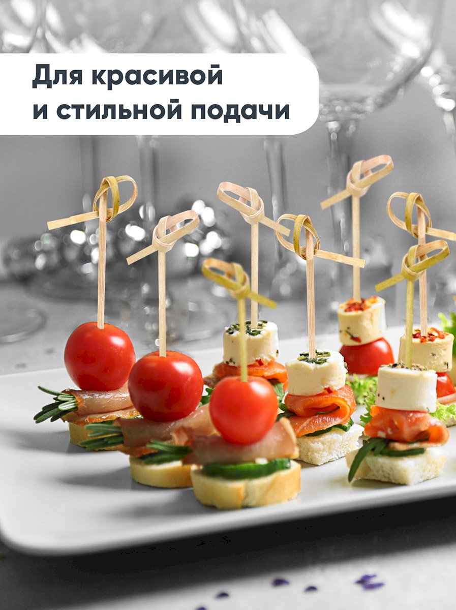 Пики для канапе Узелок бамбуковые длина 8 см, изготовлены из натурального бамбука. Используются для создания канапе, мини-бутербродов, украшения блюд. Остро заточенные, прочные. Длина пики для канапе — 8 см.