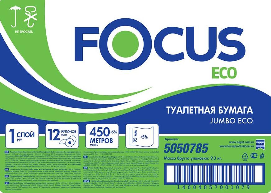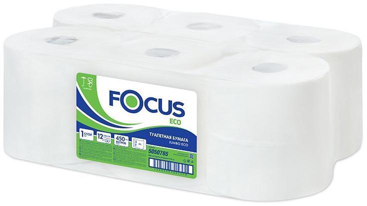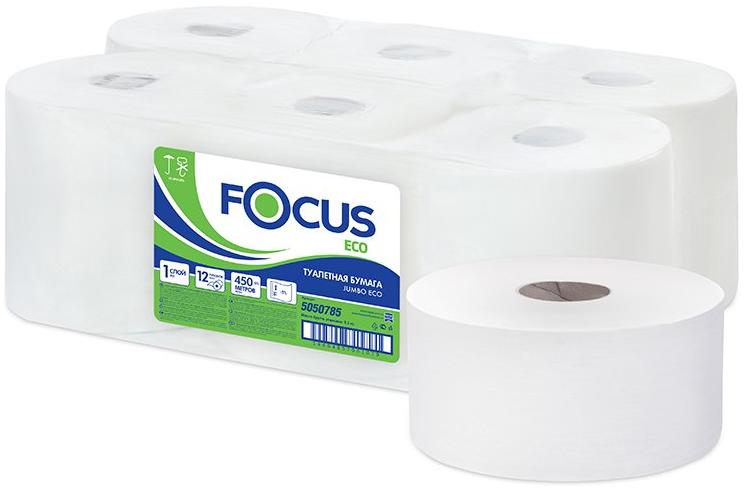 Туалетная бумага Focus Jumbo Eco, однослойная белая, 450 метров в рулоне, изготовлена из целлюлозы. Имеет длину намотки 450 метров. Подходит для мест с высокой проходимостью. Диаметр рулона 20 см. Без перфорации.