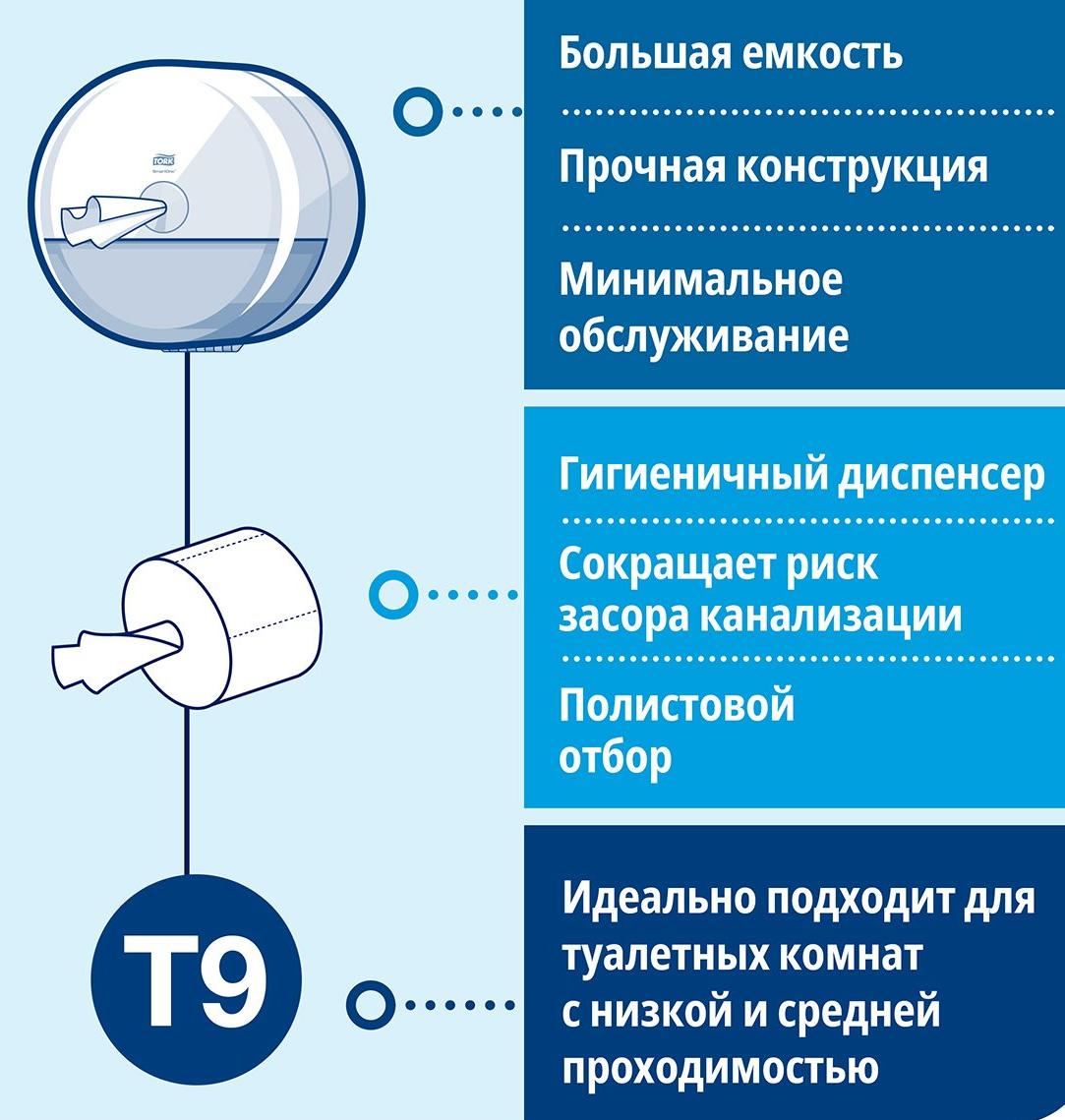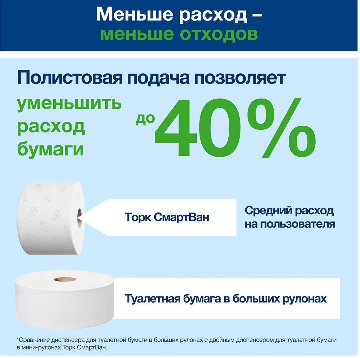 Туалетная бумага Торк СмартВан Комфорт Мини, двухслойная T9, 472261 белая, 130 метров в рулоне, в мини рулонах изготовлена из вторичного сырья. Тиснение обеспечивает повышенную мягкость и впитываемость. Быстро растворяется в воде, не создает засоров системы канализации. Имеет перфорацию. Рулоны совместимы с диспенсерами системы Т9, которая обеспечивает сокращенный расход и комфортное использование туалетной бумаги. Увеличенное количество листов позволяет реже обслуживать диспенсеры. Количество листов 765 штук. Длина намотки 130 метров. Цвет белый.