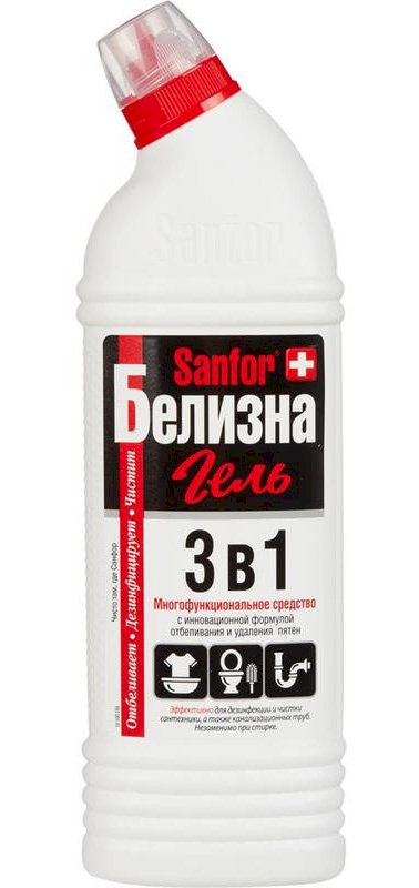 САНФОР Белизна гель 3 в 1 является многофункциональным средством для отбеливания и удаления пятен различного происхождения. Используется для чистки сантехники, а также удаления засоров и загрязнений в канализационных трубах. Не предназначено для использовании на деликатных поверхностях, при стирке шерсти, шелка и непрочно окрашенных тканей. При работе со средством рекомендовано использование хозяйственных перчаток. В пластиковом флаконе 700 мл.