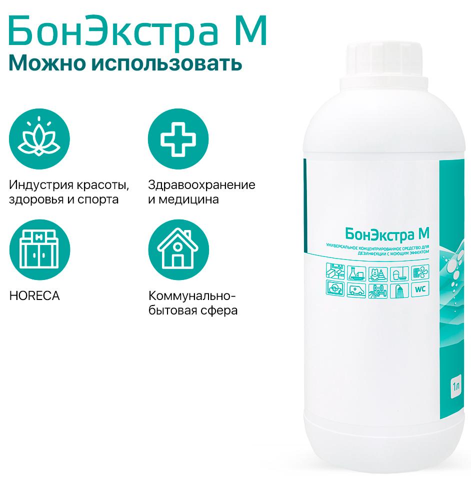Универсальное концентрированное дезинфицирующее и моющее средство БонЭкстра М. Дезинфекция, мытье и дезодорирование всех видов поверхностей, предметов интерьера, аппаратуры и оборудования, транспорта. Обеззараживание и стирка белья, в том числе совмещенные в одном процессе, и в автоматических стиральных машинах. Обеззараживание и мытье посуды, в том числе совмещенные в одном процессе, и в автоматических посудомоечных машинах. Дезинфекция наркозно-дыхательной аппаратуры, кувезов, стоматологических оттисков, зубопротезных заготовок и протезов.