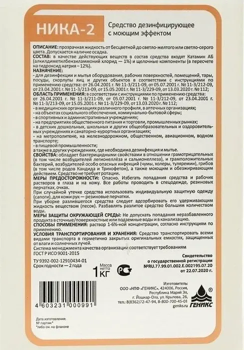 Состав, действующие вещества: гидроокись натрия-12% и алкилдиметилбензиламмоний хлорид-1%, катамин АБ, щелочные компоненты.