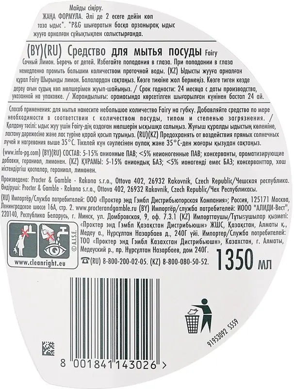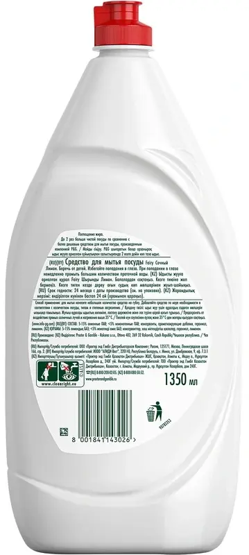Дозировка — используйте одну каплю, общий объём зависит от степени и вида загрязнения. Для мытья нанесите небольшое количество Fairy на губку.