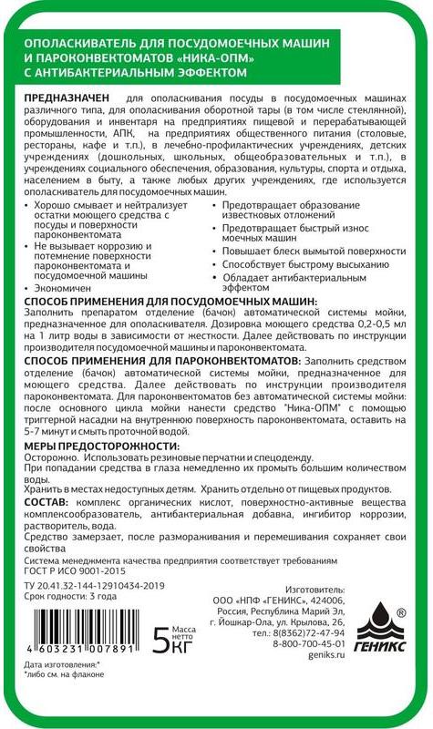 Для посудомоечных машин: заполнить препаратом отделение (бачок) автоматической системы мойки, предназначенное для ополаскивателя. Дозировка моющего средства 0,2-0,5 мл на 1 литр воды в зависимости от жесткости. Для пароконвектоматов: заполнить средством отделение (бачок) автоматической системы мойки, предназначенное для моющего средства. Далее действовать по инструкции производителя пароконвектомата. Для пароконвектоматов без автоматической системы мойки: после основного цикла мойки нанести средство «Ника-ОПМ» с помощью триггерной насадки на внутреннюю поверхность пароконвектомата, оставить на 5-7 минут и смыть проточной водой.