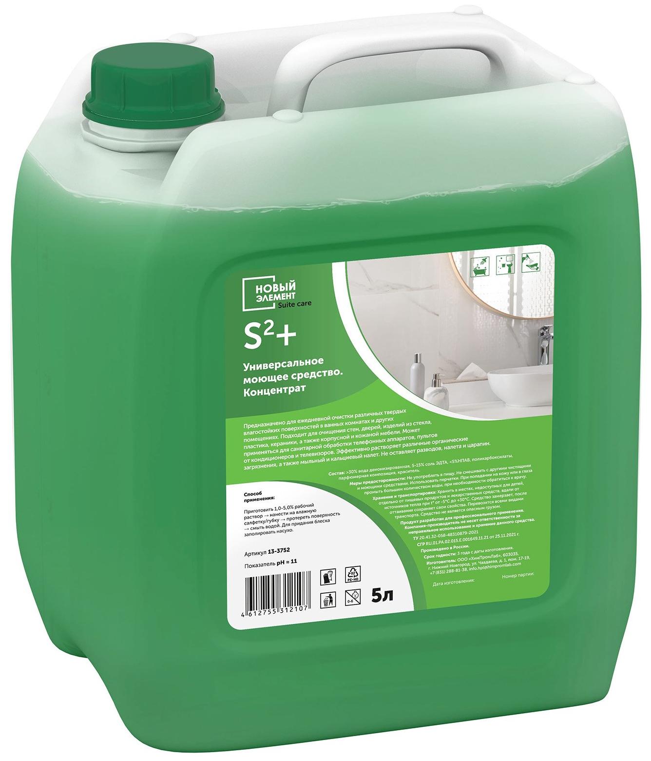 Универсальное моющее средство Новый Элемент Suite care S2 Plus. Концентрат, предназначено для ежедневной очистки различных твердых влагостойких поверхностей в ванных комнатах и других помещениях. Подходит для очищения стен, дверей, изделий из стекла, пластика, керамики, а также корпусной и кожаной мебели. Может применяться для санитарной обработки телефонных аппаратов, пультов от кондиционеров и телевизоров. Эффективно растворяет различные органические загрязнения, а также мыльный и кальциевый налет. Не оставляет разводов, налета и царапин.