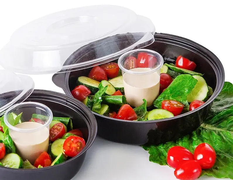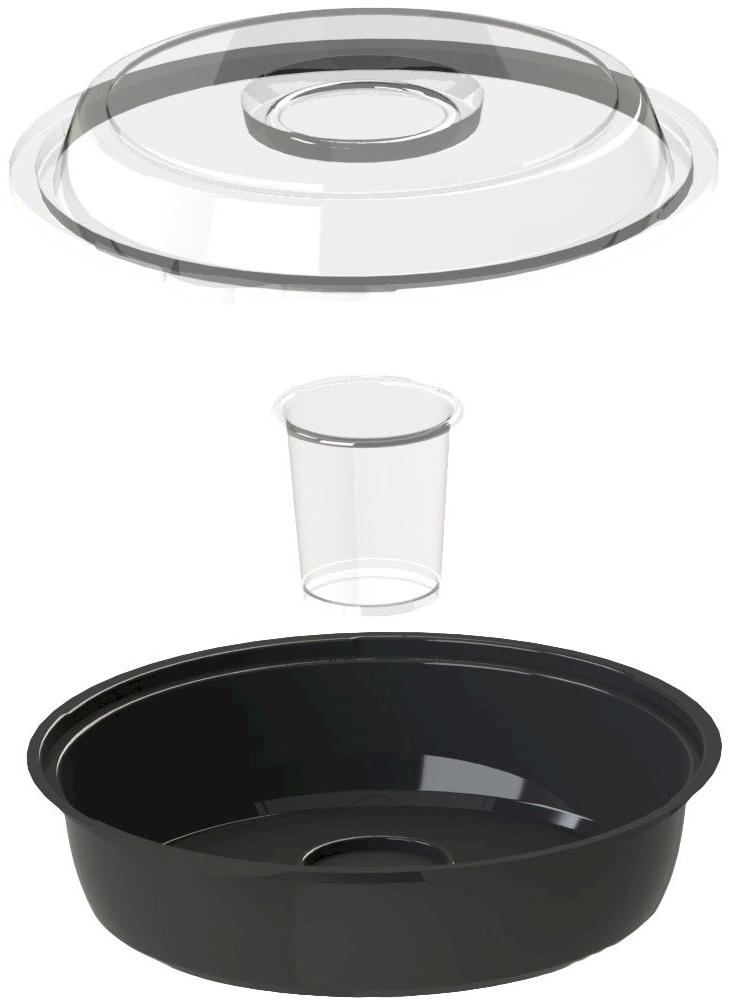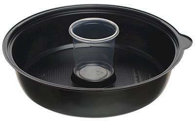 Контейнер круглый КД-106 850 мл диаметр 200 мм, с соусником 80 мл, черный PS, изготовлен из черного полистирола. Контейнер комплектуется специальным прозрачным стаканчиком под соус (80 мл) и прекрасно подходит для любых салатов и холодных закусок. Объем 850 мл, диаметр 200 мм, высота 65 мм. Поставляется без крышки, артикул крышки для контейнера 17-6245.