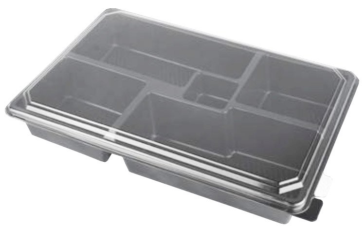 Контейнер бенто-бокс 5 секций 296х194х55 мм черный PS, контейнер содержит 5 секций. Используется в качестве упаковки для суши и роллов, также подходит для фасовки различных холодных закусок. Изготовлен из полистирола черного цвета. Размер 296х194х55 мм. Крышка для контейнера арт. 17-3430.