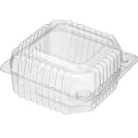 Контейнер с неразъемной крышкой прямоугольной формы изготовлен из прозрачного полистирола. Размер 120х120х63 мм. Объем 400 мл. В упаковке 700 штук.