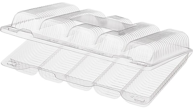 Контейнер для эклеров 236х164х50 мм, 5 ячеек РК-28С5 (Т), изготовлен из прозрачного полистирола. Предназначен для защиты кондитерских изделий от пыли, грязи, непроизвольного опрокидывания, механических воздействий. Содержит пять ячеек. Оснащен внутренним замком, крышка прочно удерживается на контейнере. Размер 236х164х50 мм.