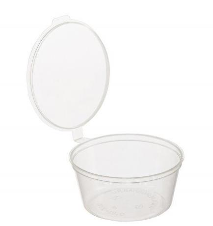 Контейнер одноразовый для соуса с откидной неразъемной крышкой изготовлен из полипропилена прозрачного цвета. Объем 50 мл. Верхний диаметр 62 мм, нижний диаметр 50 мм. В транспортной коробке 1200 штук.