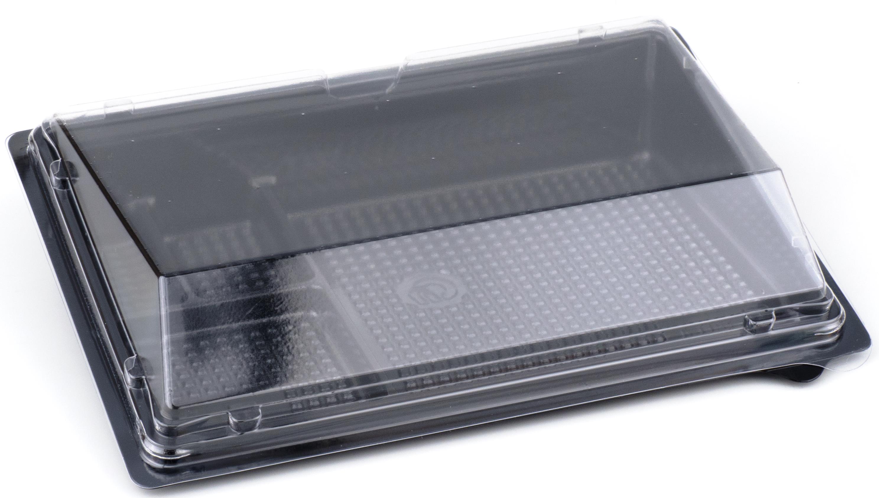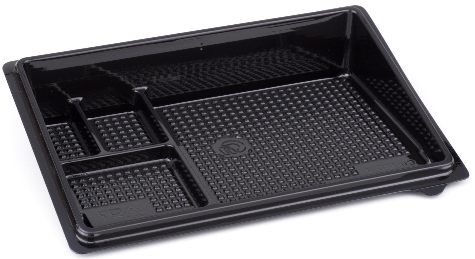 Контейнер дно черное под суши Сп-18Д/4 витрина 183х128х30 мм 4 секции ПЭТ, предназначен для фасовки суши и роллов. Имеет дополнительные три секции для соусов и специй.