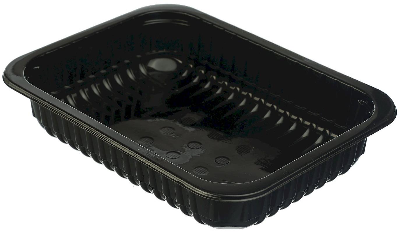 Контейнер под запайку 600 мл 187х137х37 мм черный ПП, изготовлен из полипропилена черного цвета, используется для фасовки мясных и рыбных полуфабрикатов, готовых блюд, деликатесов. Можно разогревать в СВЧ-печи. Объем 600 мл, размер 187х137х37 мм.