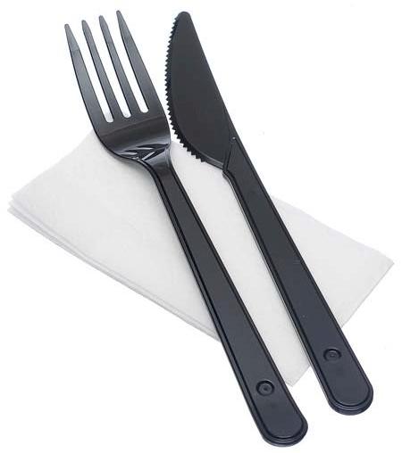Комплект одноразовых приборов "3" (вилка черная, нож черный, салфетка 24х24 см), включает в себя вилку, нож и бумажную салфетку. Приборы выполнены из пластика черного цвета. Салфетка белого цвета, 24х24 см. Комплект может быть использован в ресторанах быстрого питания и кафе с блюдами навынос. Незаменим в дороге или в поездке на природу. В индивидуальной упаковке.