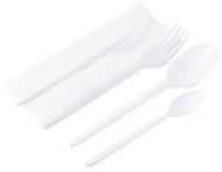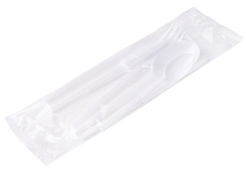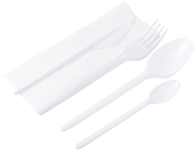 Комплект одноразовых приборов 5 (вилка, нож, чайная ложка, столовая ложка, салфетка белая 24х24 см), включает в себя набор одноразовых приборов: вилка, нож, чайная ложка и столовая ложка выполнены в белом цвете и белая однослойная салфетка размером 24х24 см. Комплект может быть использован в ресторанах быстрого питания и кафе с блюдами навынос. Незаменим в дороге или в поездке на природу. Прозрачная упаковка позволяет видеть наличие и сохранность приборов.
