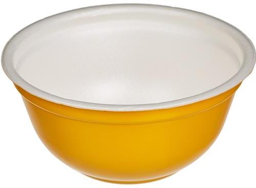 Миска одноразовая 500 мл, желтая, диаметр 135 мм, изготовлена из вспененного полистирола, полистирол насыщен пузырьками воздуха, он имеет очень высокие теплоизоляционные характеристики еда в таких мисках способна сохранятся теплой очень длительное время. Предназначена для холодных и горячих пищевых продуктов, в том числе жидких блюд. Широко применяется в сфере быстрого питания, в выездных мероприятиях.