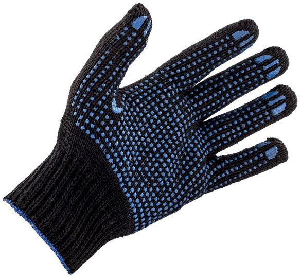 Перчатки хлопчатобумажные с ПВХ напылением, 5 нитей, 7 класс, черные, предназначены для выполнения строительных и сельскохозяйственных работ, а также для точных ручных механосборочных работ. С точечным ПВХ напылением для предотвращения скольжения рук и меньшего истирания перчаток во время работ. Перчатки кругловязаные, с эластичными манжетами, которые мягко прилегают к кисти и предотвращают попадание бытового мусора внутрь перчаток. Обеспечивают свободный воздухообмен благодаря натуральной хлопчатобумажной основе. Черного цвета, 5-ти нитка, 7 класс.