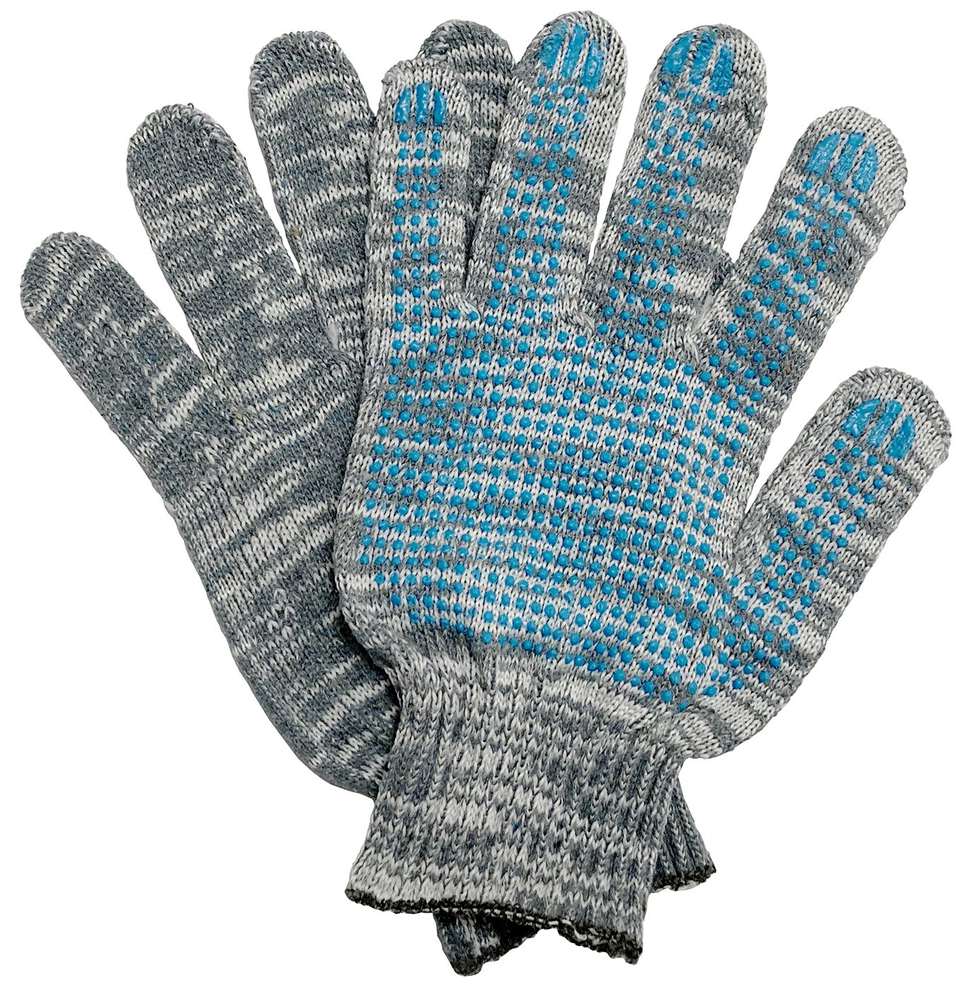 Перчатки хлопчатобумажные с ПВХ, 6 нитей, 10 класс, серые, используются для выполнения работ не связанных с большими механическими нагрузками. Имеют точечное ПВХ напыление для предотвращения скольжения рук и меньшего истирания перчаток во время работ. Перчатки изготовлены из натуральной гипоаллергенного хлопка в 6 нитей бесшовным методом, позволяющим избежать натирания кожи при работе. Материал изделия способствует свободному влаго- и воздухообмену, предотвращает потение рук, обеспечивает свободу движений и сохраняет высокую чувствительность пальцев. Перчатки рекомендуются к применению в хозяйственно-бытовых, ремонтных и садово-огородных работах. Цвет серый, 6-х нитка, 10 класс вязки.