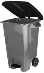 Контейнер для мусора 100 литров, на колесах с педалью и крышкой, пластик, серый, изготовлен из ударопрочного пластика толщиной 2,5 мм. Оснащен широкими и прочными колесами, позволяющими наклонять и перемещать наполненный бак по любой поверхности. Имеет широкую педаль для подъема и фиксации крышки. Для обеспечения чистоты может быть использован совместно с мешками для мусора размером 90х120 см. Выдерживает нагрузку до 300 кг. Устойчив к перепадам температур от -45 до +65°С, прямым солнечным лучам, повышенной влажности. Предназначен для использования в загородных домах, офисах, торговых помещениях, на производственных площадках. Цвет серый. Поверхность гладкая, матовая.