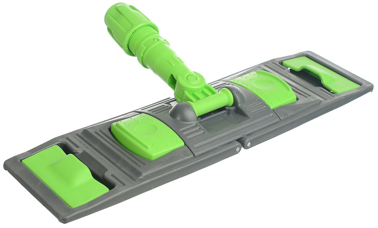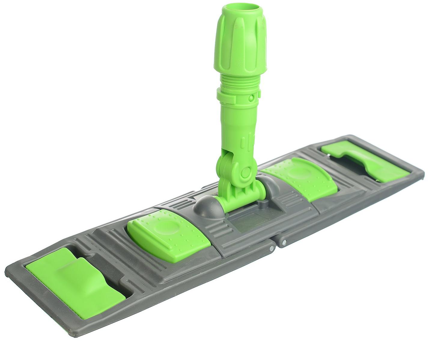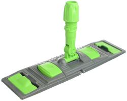 Держатель мопов пластиковый 40х11 см универсальный, зеленый. Флаундер с универсальным держателем, к которому подходят как мопы со специальным карманом, так и с креплением «уши». Конструкция оснащена двумя педалями, которые позволяют раскрывать флаундер одним движением, не наклоняясь и не контактируя с грязной водой. Нижняя сторона дополнена специальными зубчиками, которые усиливают сцепление мопа с флаундером. Шарнирное крепление обеспечивает подвижность флаундера и позволяет производить уборку в любом направлении, без труда поворачивая швабру в нужную сторону. Мытье производится качественно и без лишних усилий за счет равномерно плотного прижатия мопа к обрабатываемой поверхности. Размер 40х11см. К держателю подходят МОПы арт. 31-0741, 31-0743, 31-0844, 31-0748, рукоятки арт. 31-3381, 31-3382,31-3383, 31-3384.
