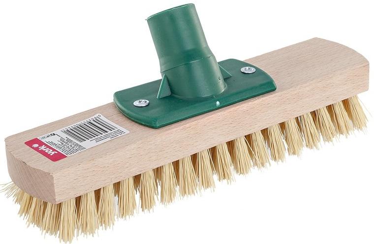 Щетка скраббер 24 см для пола York деревянная, без рукоятки, изготовлена из дерева, имеет очень жесткую щетину, которая прекрасно справляется с сильным загрязнением, снабжена пластмассовой резьбой, которая идеально подходит к рукоятке. Крепление для рукоятки расположено под углом, что обеспечивает надежную и плотную посадку рукоятки, за счет чего повышается комфорт и производительность работы. Подходит для подметания жесткой и устойчивой к царапинам поверхности - улиц, тротуаров, а также брусчатки. Размер 24х13х6 см.