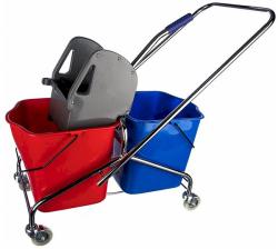 Тележка уборочная пластиковая 2 ведра по 25 литров с отжимом, предназначена для уборки в помещениях. Прочный хромированный металлический каркас на колесах, на котором установлено 2 пластиковых ведра для воды, объемом по 23 литра, механический отжим для петельных тряпок и МОПов. Удобная рукоятка для передвижения тележки.