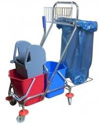 Тележка уборочная на 2 ведра по 17 литров, с механическим отжимом, корзиной и держателем для мусорного мешка. Тележка уборочная, предназначена для уборки в помещениях небольшой площади. Прочный хромированный металлический каркас на колесах, на котором установлено 2 пластиковых ведра для воды, объем 17 л, механический отжим для петельных тряпок и МОПов, большая сетчатая корзина для хранения и перемещения бытовой химии, хромированный держатель мешка для мусора. Удобная рукоятка для передвижения тележки.