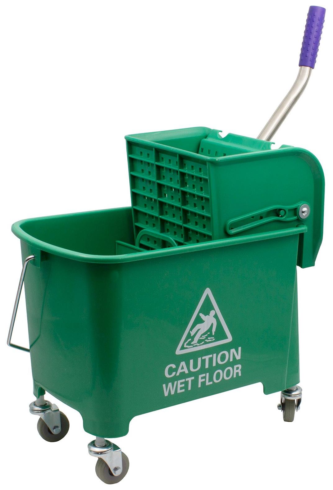 Ведро на колесах с отжимом 20 литров, зеленое, выполнено из противоударного пластика зеленого цвета. Объем 20 литров. Используется для мытья полов во внутренних помещениях. Наличие совместимого с любыми насадками отжима исключает контакт грязного инвентаря с руками. Сетчатая поверхность отжима удерживает мусор и мелкую грязь внутри. Металлическое основание с колесиками облегчает маневренность инвентаря, сокращает время профессиональной уборки помещений, не царапает покрытие пола.