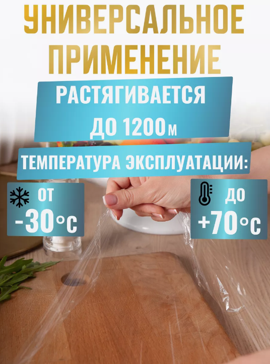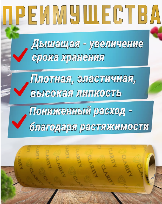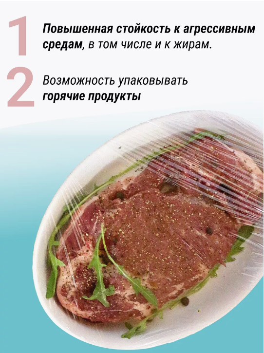 Упаковка сформированная с применением данной пленки, продолжительное время сохраняет привлекательный вид, без морщин и вмятин. Соответствует всем требованиям для упаковочных материалов, экологически чистая, отлично сохраняет свежесть продуктов внутри, защищает от пыли и грязи. Пленка произведена по CAST технологии. Обладает всеми преимуществами стрейч-пленки ПВХ. Отличается повышенной липкостью и эластичностью, глянцем и прозрачностью (видно втулку на рулоне). Обеспечивает увеличение сроков хранения продукции в несколько раз, за счет высокой газопроницаемости. За это свойство пленку называют "дышащей". Благодаря этому свойству, отлично сохраняет внешний вид и вкусовые качества продукта, препятствуя распространению бактерий. Обладает Антифоговым эффектом (антироса), позволяет упаковывать горячие продукты, препятствует образованию конденсата на внутренней поверхности упаковки. Обладает повышенной стойкостью к агрессивным средам, в том числе к жирам. Прекрасно работают на холодных столах. Устойчива к высоким температурам, продукт можно разогревать в микроволновой печи до +50°С, (продукт не должен лежать на вспененной подложке! и не должен иметь температуру выше +50°С!). Сохраняет свои прочностные характеристики при заморозке и перепадах температур. Возможно использование под глубокую заморозку до температуры -35°С. Цвет пленки прозрачный. Поставляется в индивидуальной картонной упаковке. В рулоне 500 метров. Производство Россия.
