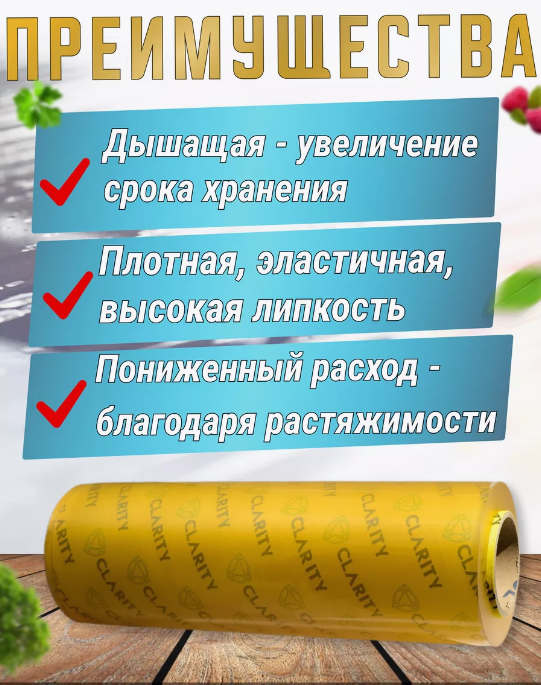 Упаковка сформированная с применением данной пленки, продолжительное время сохраняет привлекательный вид, без морщин и вмятин. Соответствует всем требованиям для упаковочных материалов, экологически чистая, отлично сохраняет свежесть продуктов внутри, защищает от пыли и грязи. Пленка произведена по CAST технологии. Обладает всеми преимуществами стрейч-пленки ПВХ. Отличается повышенной липкостью и эластичностью, глянцем и прозрачностью (видно втулку на рулоне). Обеспечивает увеличение сроков хранения продукции в несколько раз, за счет высокой газопроницаемости. За это свойство пленку называют "дышащей". Благодаря этому свойству, отлично сохраняет внешний вид и вкусовые качества продукта, препятствуя распространению бактерий. Обладает Антифоговым эффектом (антироса), позволяет упаковывать горячие продукты, препятствует образованию конденсата на внутренней поверхности упаковки. Обладает повышенной стойкостью к агрессивным средам, в том числе к жирам. Прекрасно работают на холодных столах. Устойчива к высоким температурам, продукт можно разогревать в микроволновой печи до +50°С, (продукт не должен лежать на вспененной подложке! и не должен иметь температуру выше +50°С!). Сохраняет свои прочностные характеристики при заморозке и перепадах температур. Возможно использование под глубокую заморозку до температуры -35°С. Цвет пленки прозрачный. Поставляется в индивидуальной картонной упаковке. В рулоне 500 метров. Производство Россия.